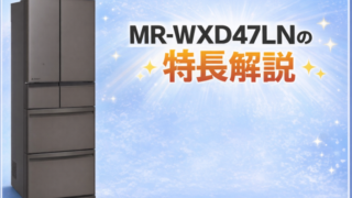 MR-WXD47LNの特長を徹底解説。幅65cmロータイプ470L、静音約15dB、年間消費電力量256kWh/年。できちゃうV冷凍+、切れちゃう瞬冷凍A.I.、氷点下ストッカーD A.I.、朝どれ野菜室、全室独立おまかせA.I.、スマホ連携まで、購入前に押さえるポイントをまとめました。