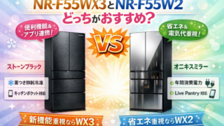 NR-F55WX3とNR-F55WX2の違いは?冷凍室まわりの特徴、省エネ性能、アプリ対応、カラー展開を比較しながら、それぞれどんな人におすすめなのかをわかりやすく紹介します。