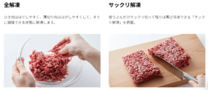 ひき肉をほぐしやすく、薄切り肉ははがしやすい全解凍、必要分だけ切って再冷凍しやすいサックリ解凍など、冷凍ストック派の時短に向きます。