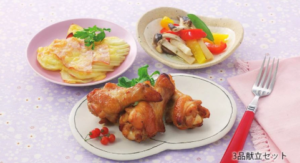 主菜1品+副菜2品を組み合わせ、同時に加熱できる「3品献立セット」が特徴。
