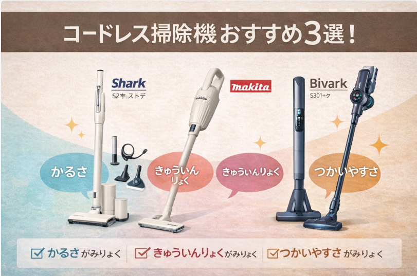 コードレス掃除機は、軽さ・吸引力・収納のしやすさのどこを重視するかで、ぴったりなモデルが変わります。