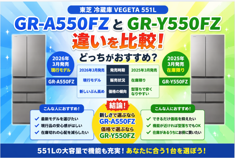 A. 新しい型番の安心感や買いやすさを重視するならGR-A550FZ、少しでも予算を抑えたいならGR-Y550FZがおすすめです。