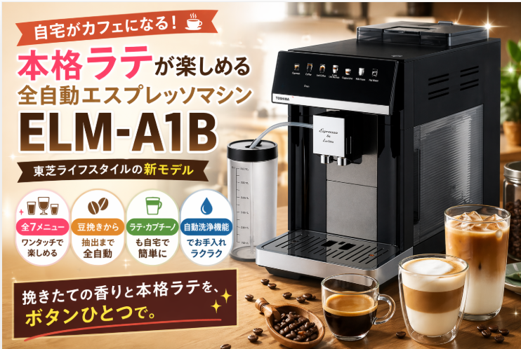 ELM-A1Bは、豆挽きから抽出、ミルクメニューまで楽しめる東芝の全自動エスプレッソ&ラテマシンです。