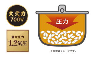 炊飯中は、最大1.2気圧の圧力をかけながら約700Wの高火力で一気に加熱。