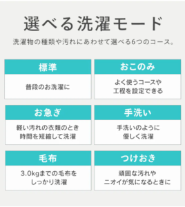 標準・お急ぎ・手洗い・毛布・つけおき…など、よく使うコースはひと通りそろっている一方、「細かくこだわったドライ・デリケート系コースがほしい」という人には、物足りなさを感じる可能性があります。