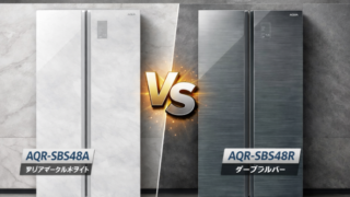 AQUA冷蔵庫「AQR-SBS48A」と旧モデル「AQR-SBS48R」の違いを徹底比較。大理石調ホワイトとダークシルバーのデザイン差、容量475Lやサイズなど共通点、どっちが向いているかまで分かりやすく解説しています。